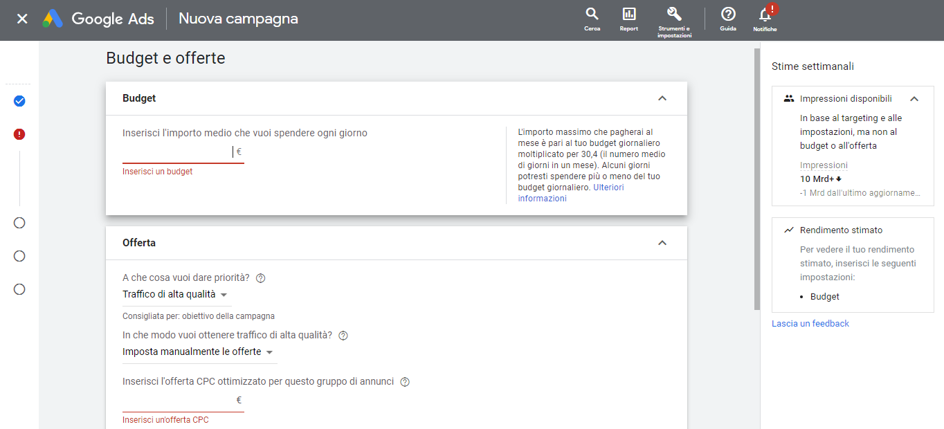 Hai impostato il budget e hai definito la strategie di offerta migliore per la tua campagna.