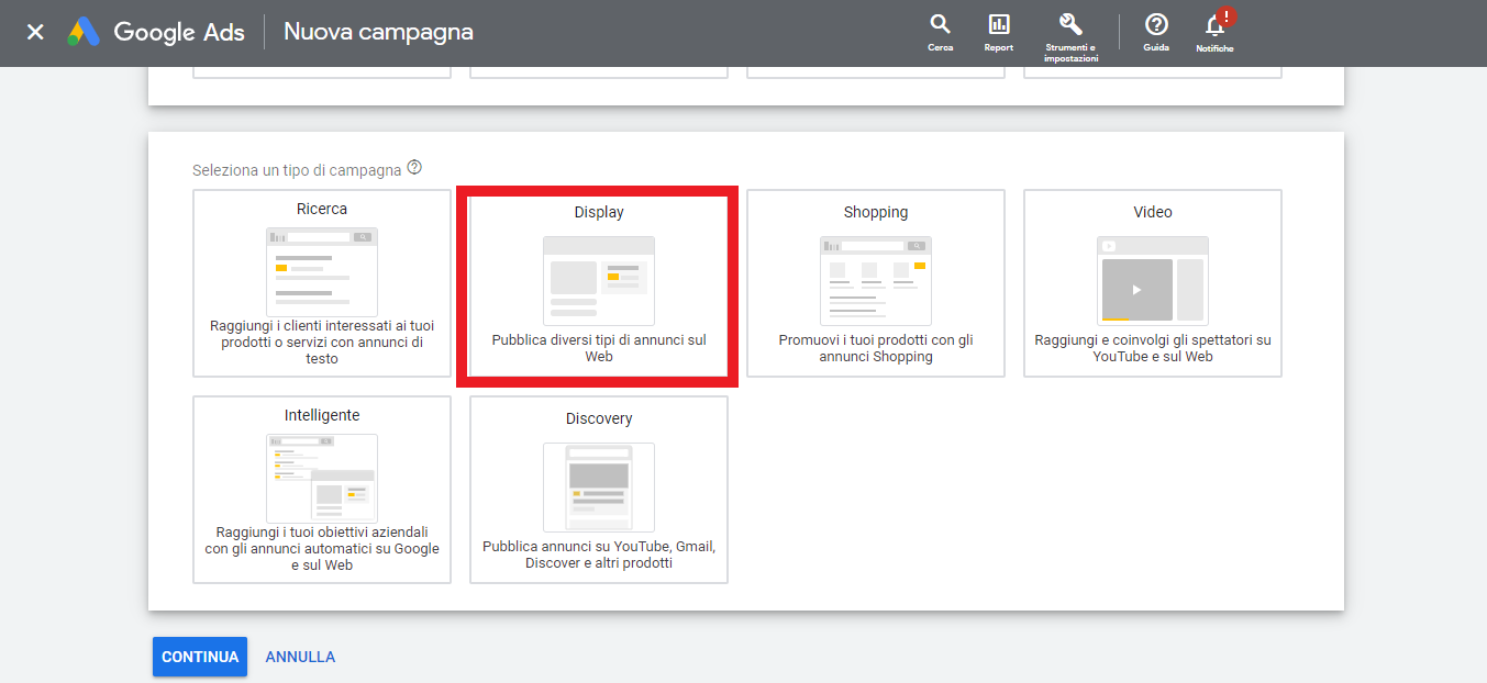 A questo punto potrai scegliere la campagna display, cliccando su “display”.