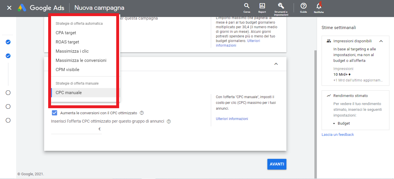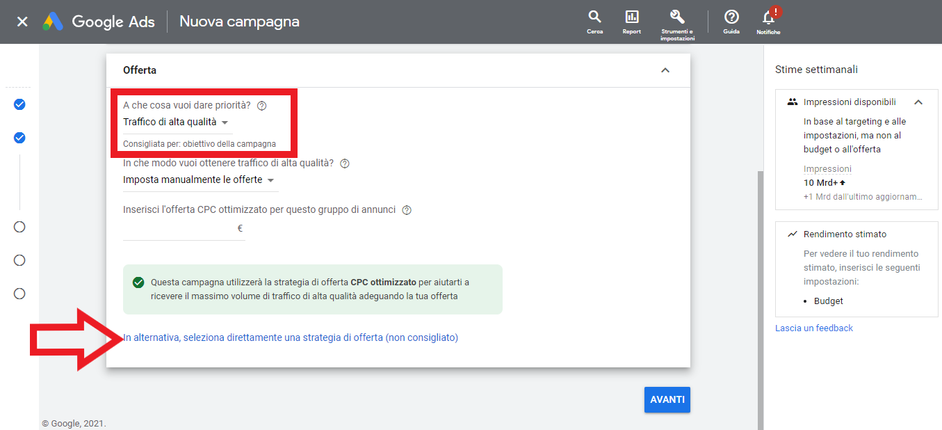 Nel caso in cui tu sia alle prime armi segui l’opzione che ti consiglia Google Ads, in base all’obiettivo campagna che hai scelto precedentemente.