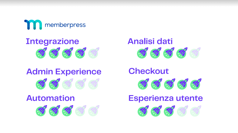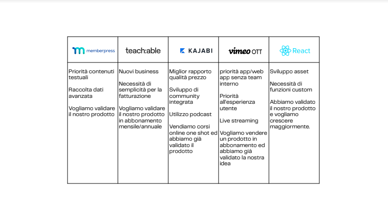 - Memberpress è la soluzione meno costosa, adatta se vogliamo dare priorità ai contenuti testuali e abbiamo necessità di validare il nostro prodotto;
