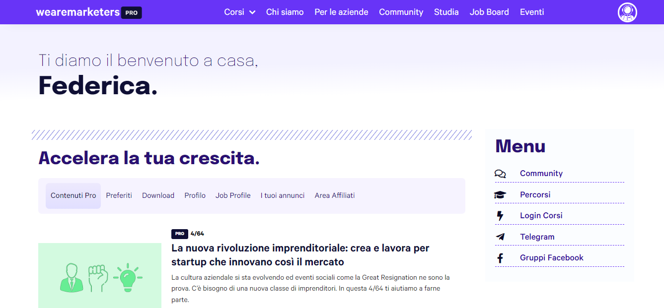 Un esempio può essere il nostro Marketers Pro: una community esclusiva dove è possibile trovare materiale inedito, corsi, consultare o pubblicare annunci di lavoro nel mondo del marketing digitale e creare il tuo profilo per la nostra community privata.