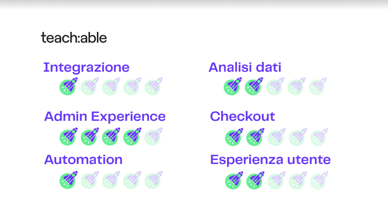 Considerazioni finali? Voti forse un po’ bassini… ma questa è la nostra esperienza: Teachable è un’ottima piattaforma per chi inizia ma limitante per i business in crescita.