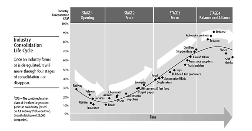 L’analisi attraverso la Consolidation Curve descrive che quasi tutte le industrie progrediscono in modo prevedibile attraverso un chiaro ciclo di vita di consolidamento e che le aziende possono tracciare con una certa precisione a che punto del ciclo si trovano.