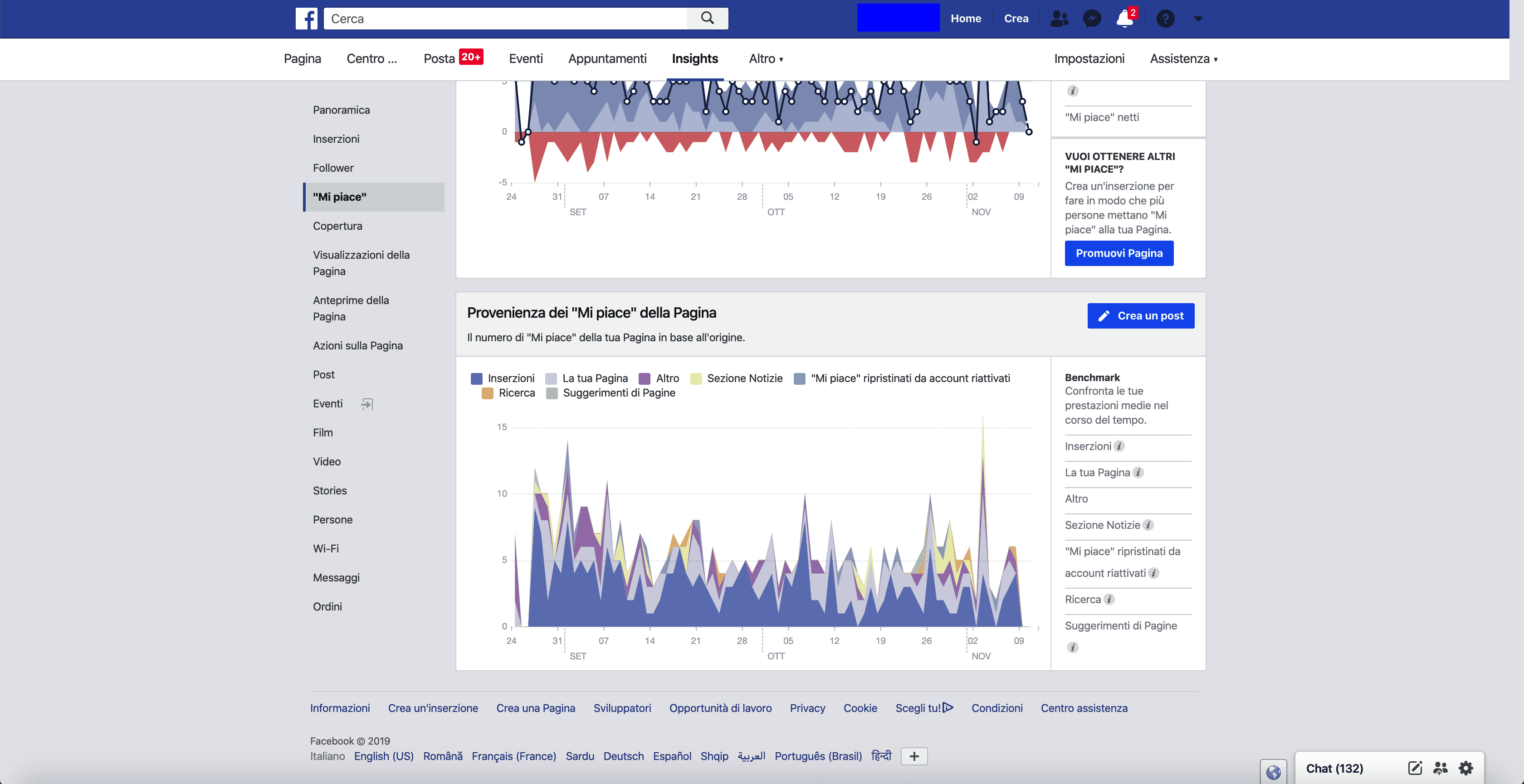 Al suo interno troverai il totale dei mi piace riferiti ad un arco temporale specifico, i mi piace netti e la provenienza dei mi piace.