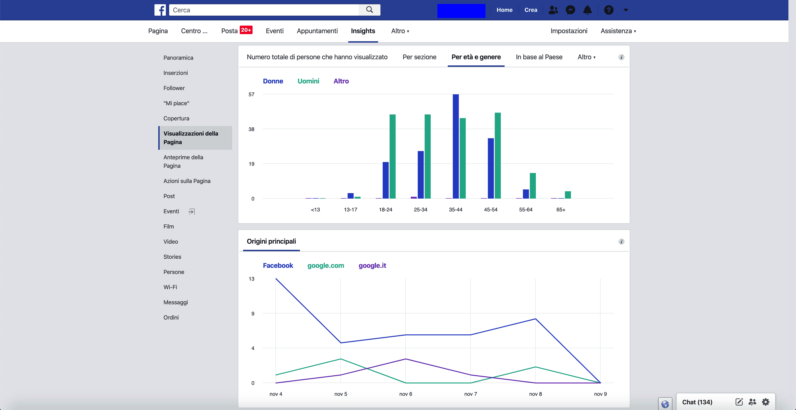 - le visualizzazioni della pagina, per analizzare ancora più approfonditamente come è composto il pubblico che guarda i nostri contenuti con più interesse;