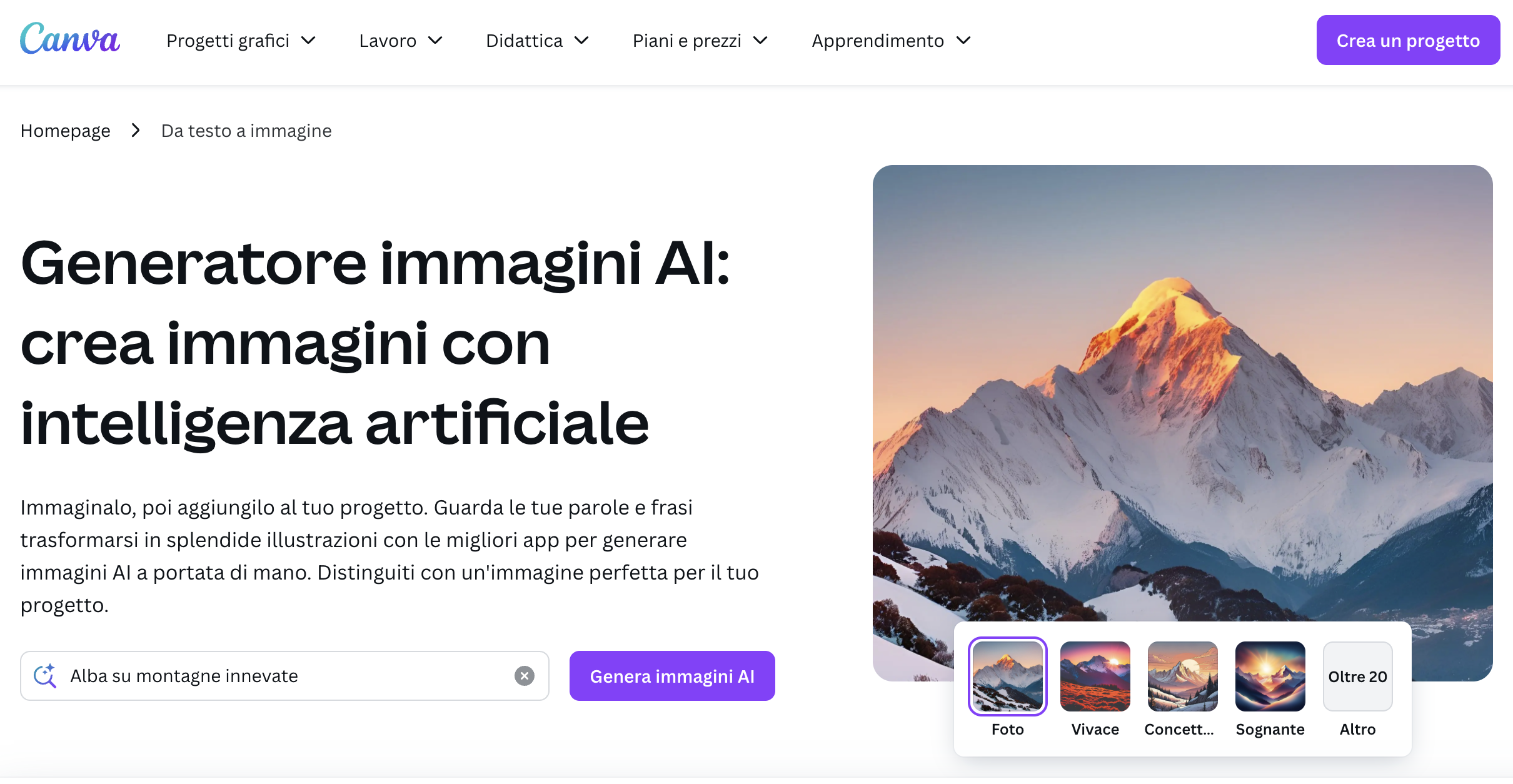 - Text to Image: puoi scrivere un prompt e lasciare che Canva generi per te un’immagine completamente nuova, sfruttando l’AI generativa. Una funzione perfetta per arricchire progetti con visual originali o fare brainstorming visivo.