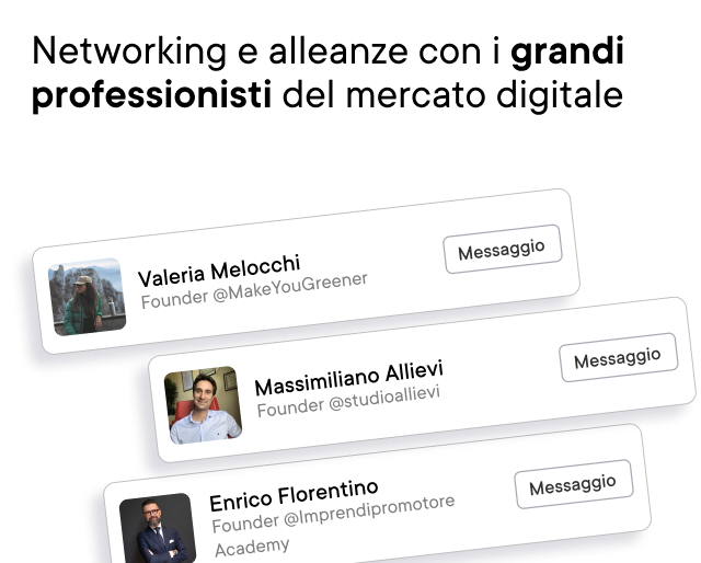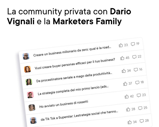 Accettando di seguire questo Corso, verrai automaticamente teletrasportato nella scuola d’élite di Marketers al mercato digitale: Marketers Pro. Dentro ti aspetta una community privata di marketers, content creators e imprenditori digitali.