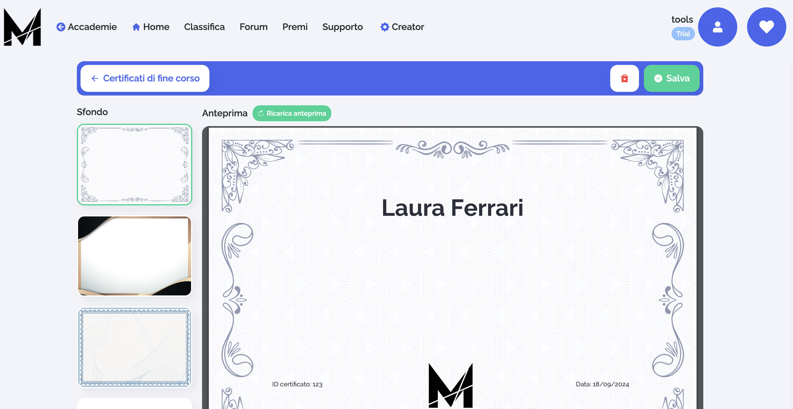 La creazione dei certificati è completamente personalizzabile: puoi scegliere tra vari template, modificare il testo e aggiungere il logo della tua accademia per rendere il certificato professionale e rappresentativo del tuo brand.