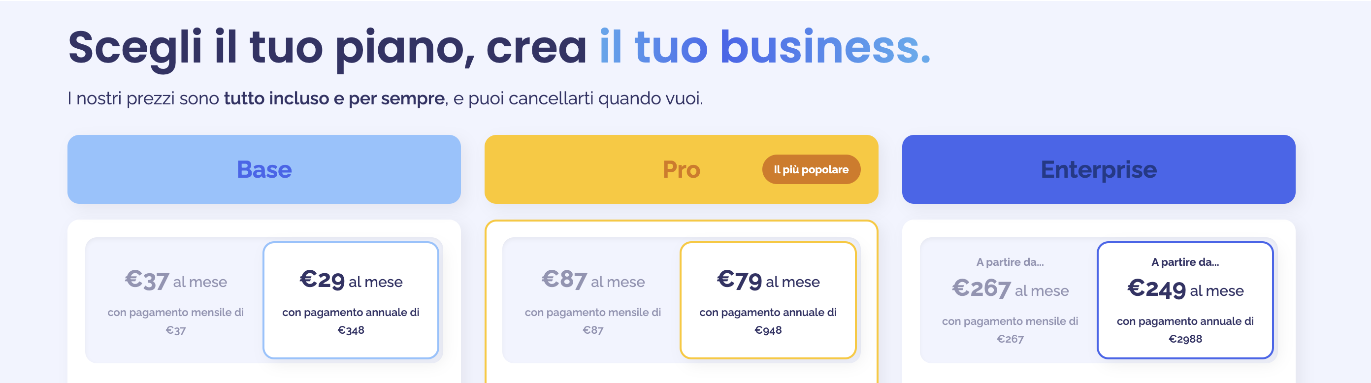 La piattaforma offre prezzi trasparenti, senza costi nascosti, con la possibilità di scegliere piani mensili o annuali e annullare l’abbonamento in qualsiasi momento.