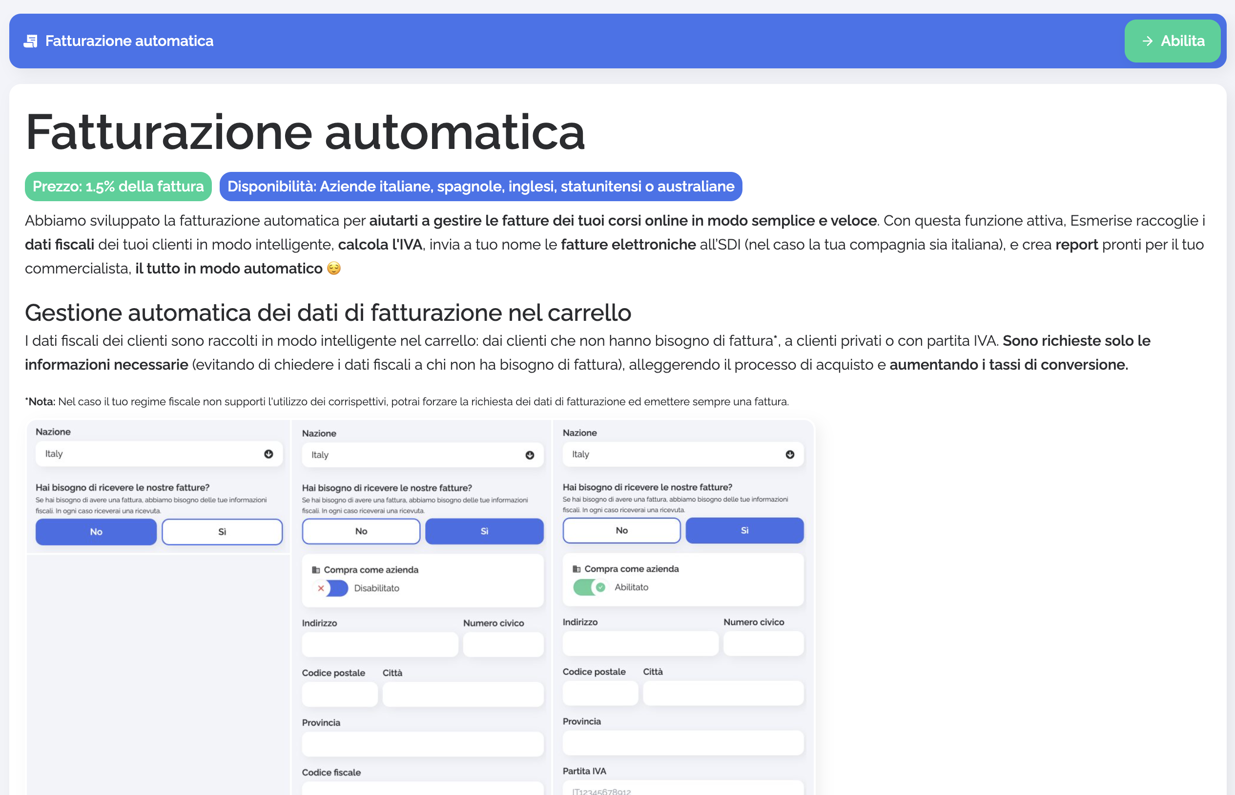 Una delle caratteristiche più utili di Esmerise è la fatturazione automatica, che rende la gestione dei pagamenti estremamente semplice.