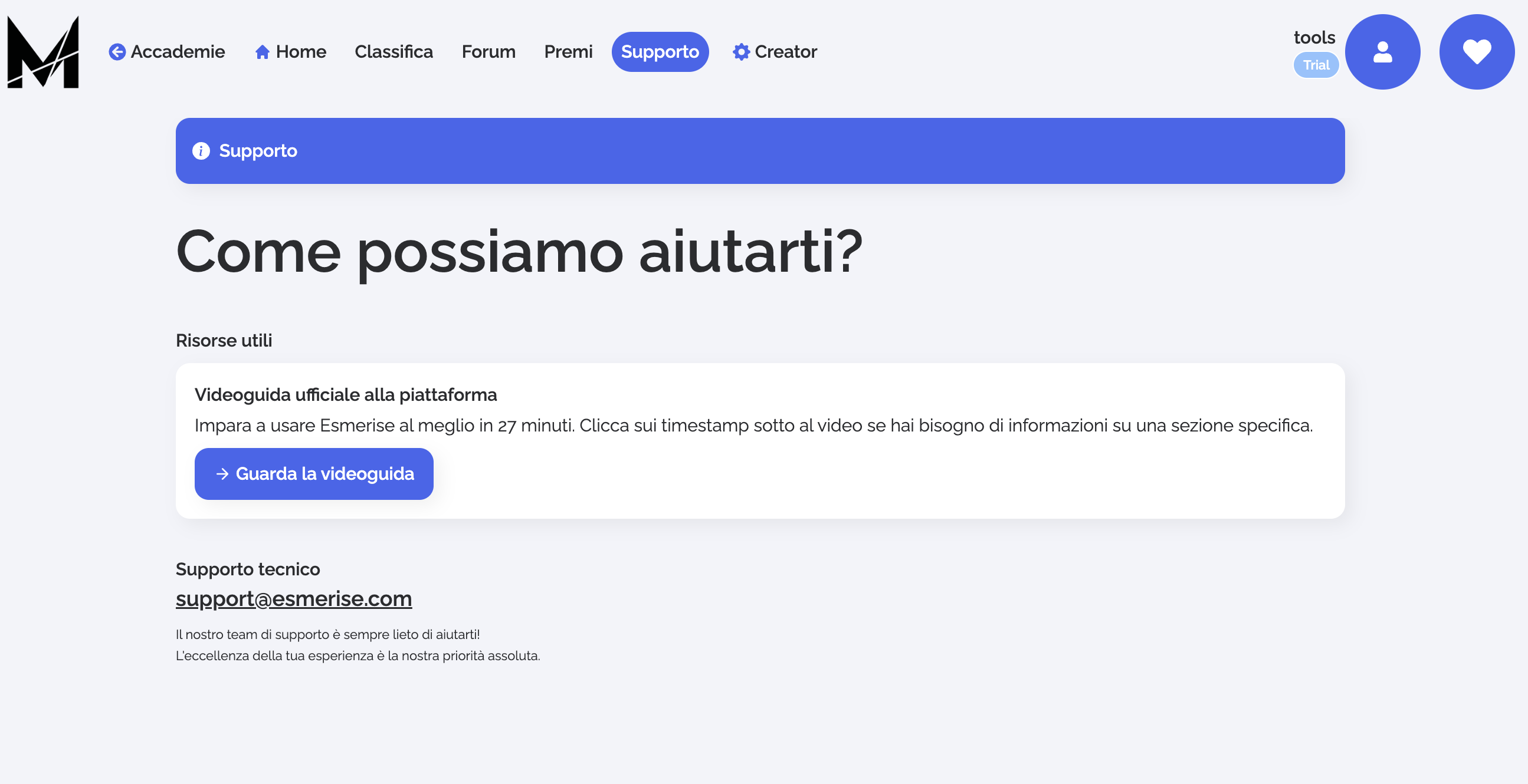 Esmerise si distingue non solo per le sue varie funzionalità che abbiamo visto fino ad ora, ma anche per l'attenzione riservata al supporto e al learning.