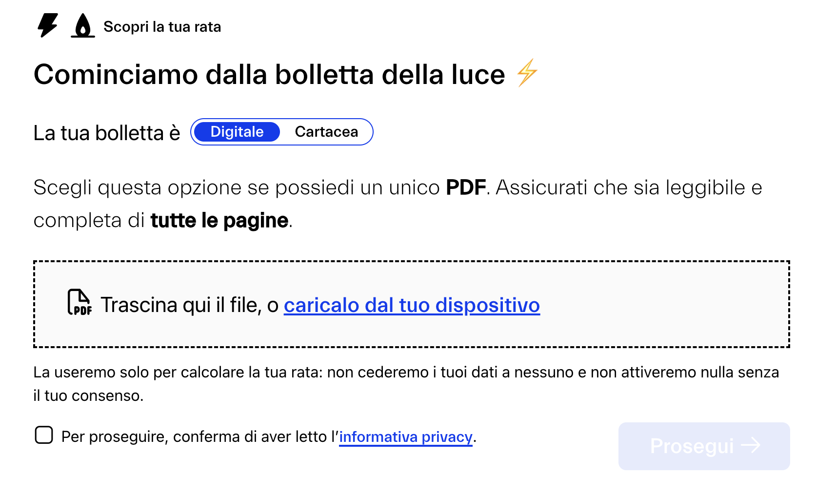 1. Carica la tua bolletta: questo passaggio è fondamentale perché NeN utilizza i dati della tua fornitura e i tuoi consumi passati per calcolare la rata fissa personalizzata che ti permetterà di sapere esattamente quanto pagherai ogni mese.