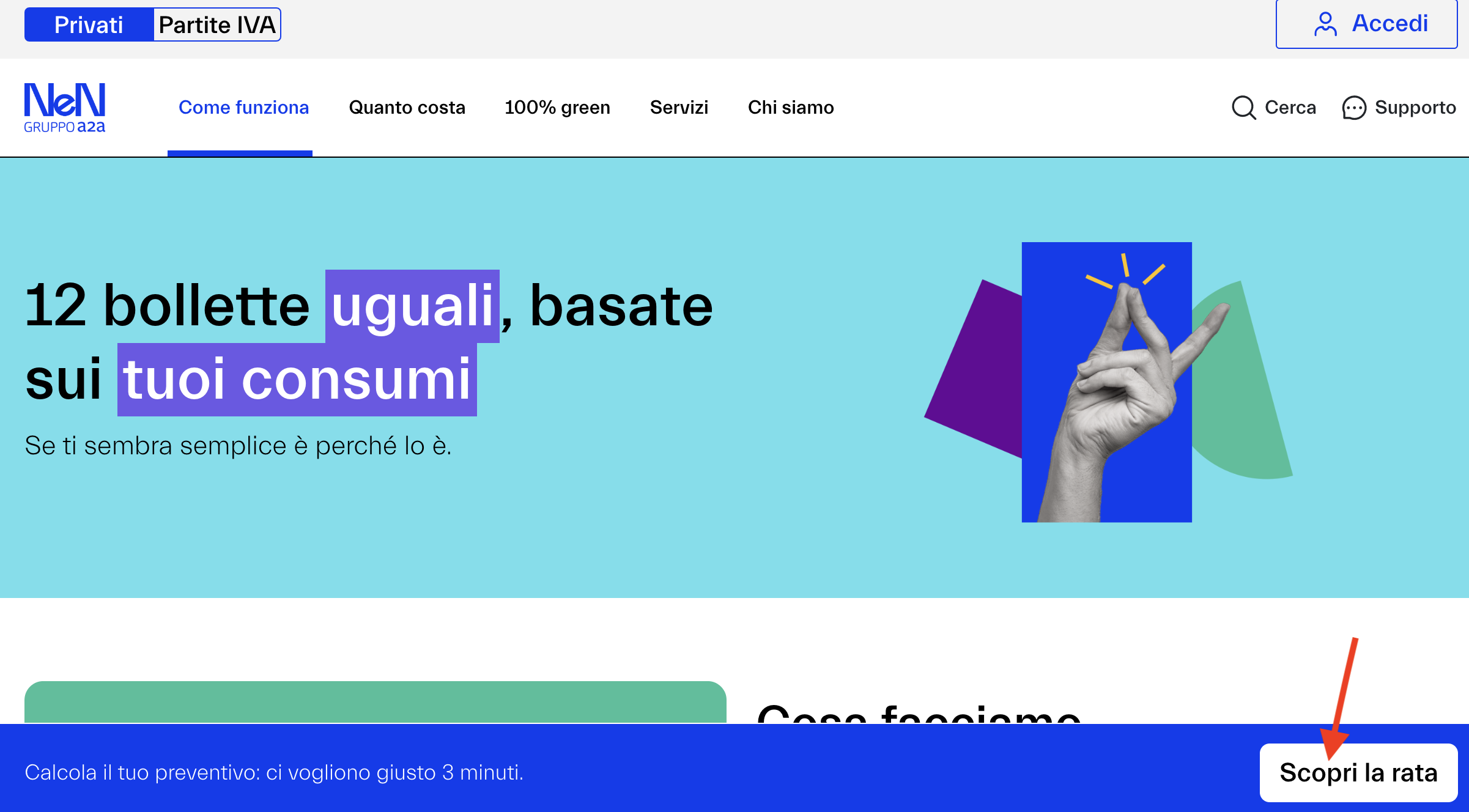 - Calcolo della rata fissa: NeN prende in esame i tuoi consumi dell'ultimo anno, recuperando i dati dalla tua bolletta più recente col vecchio fornitore. Questi vengono utilizzati per stimare la spesa annuale, che viene divisa in 12 rate mensili uguali, aggiornandosi ogni anno sulla base dei consumi effettivi e sul prezzo della materia prima (quindi no, non è un all you can eat!). Questo significa che avrai la certezza di quanto spenderai ogni mese, eviterai brutte sorprese con bollette altalenanti, aiutandoti anche a pianificare meglio il bilancio familiare o aziendale.