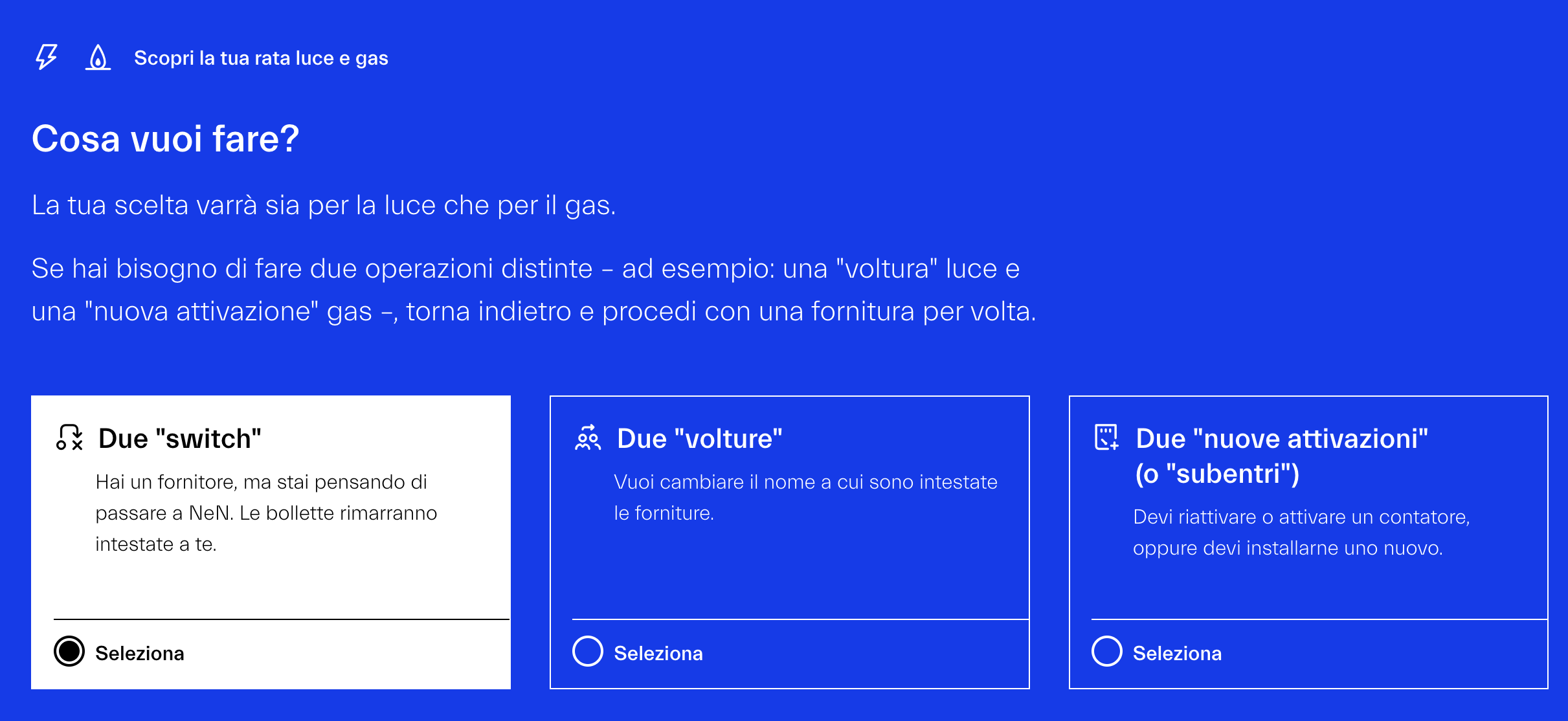 Tra i vari passaggi infatti, ti verrà richiesto se si tratta di un passaggio di fornitore, di due volture oppure di una nuova attivazione o subentro.