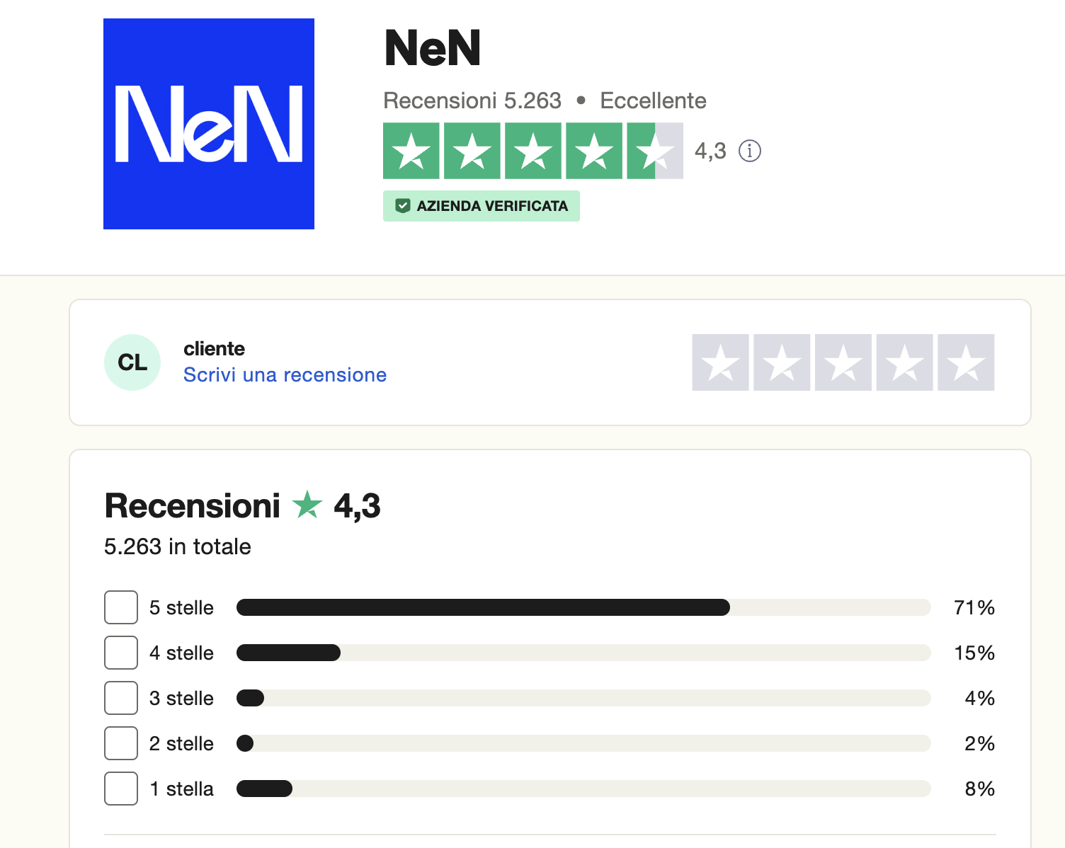 Su Trustpilot, NeN vanta un TrustScore di 4,3 su 5, basato su oltre 5.000 recensioni, con il 71% dei clienti che gli attribuiscono 5 stelle.