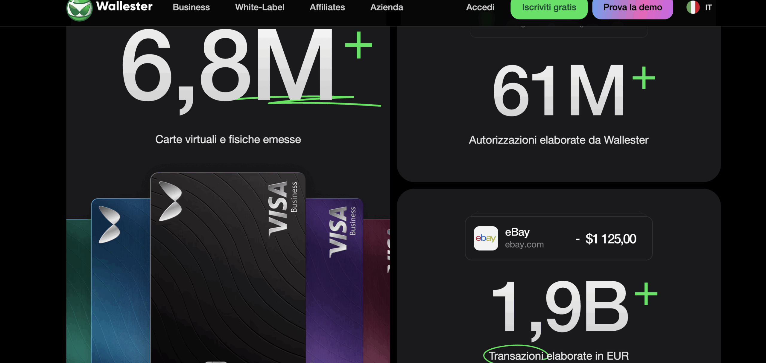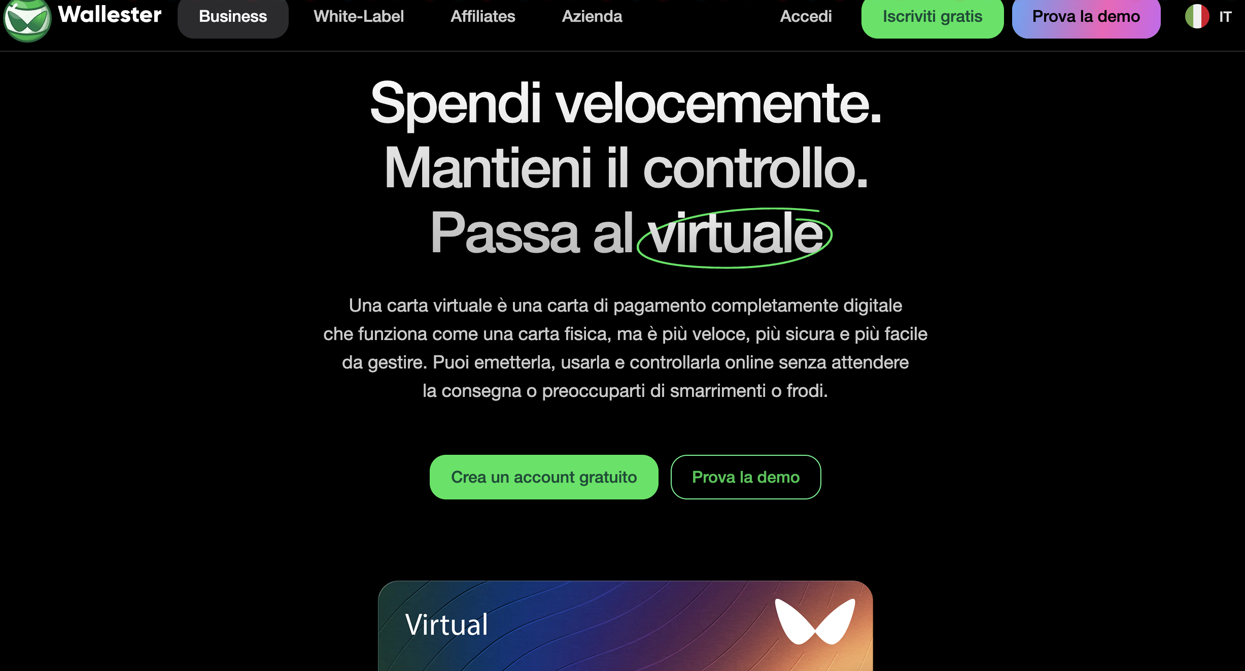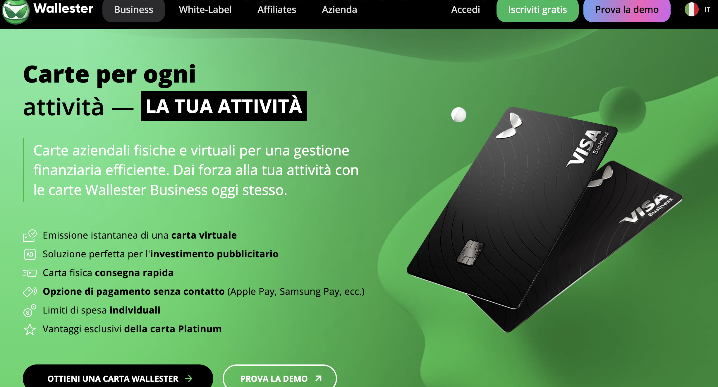 Wallester è una piattaforma di carte aziendali e gestione delle spese pensata per permettere a imprese, team e professionisti digitali di emettere carte in pochi secondi, impostare regole e limiti di utilizzo e monitorare ogni pagamento in tempo reale da un’unica dashboard.