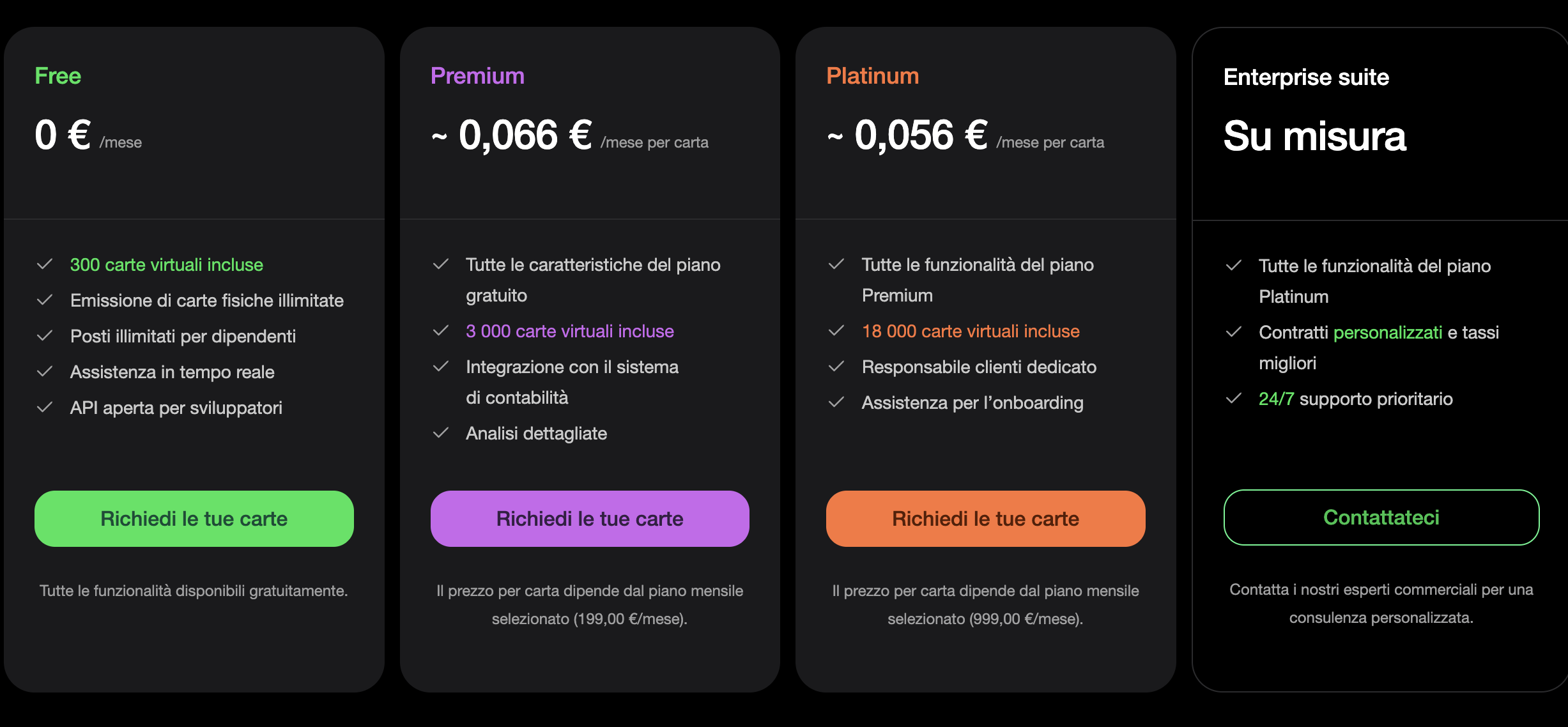 Per quanto riguarda i piani successivi invece (Premium e Platinum), pagherai pochi centesimi di € per ogni carta creata o funzione richiesta. Questa tipologia di pricing rende questi piani perfetti per la scalabilità aziendale e la previsione dei costi.