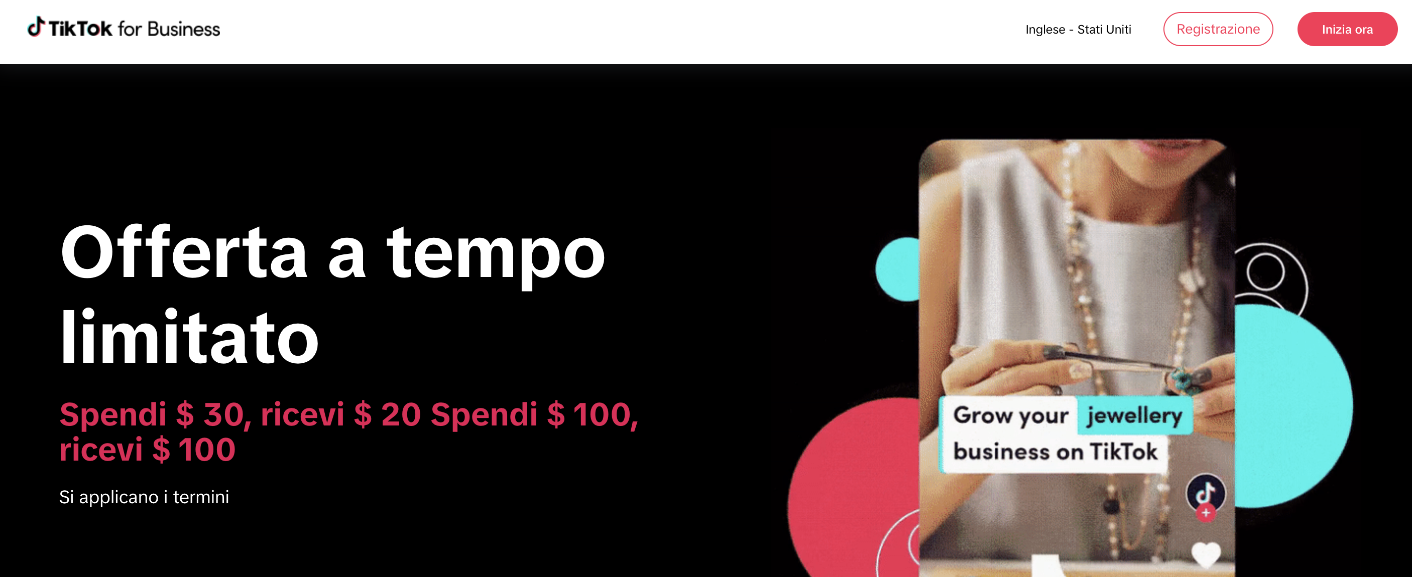 C’è un ulteriore vantaggio (esclusivo per noi Marketers): se deciderai di iscriverti ora su Tik Tok for Business, utilizzando questo link, per una spesa di 30$ ne avrai altri 20$, o ancora meglio, se spendi 100$ otterrai altri 100$ da spendere nelle tue TikTok ads!